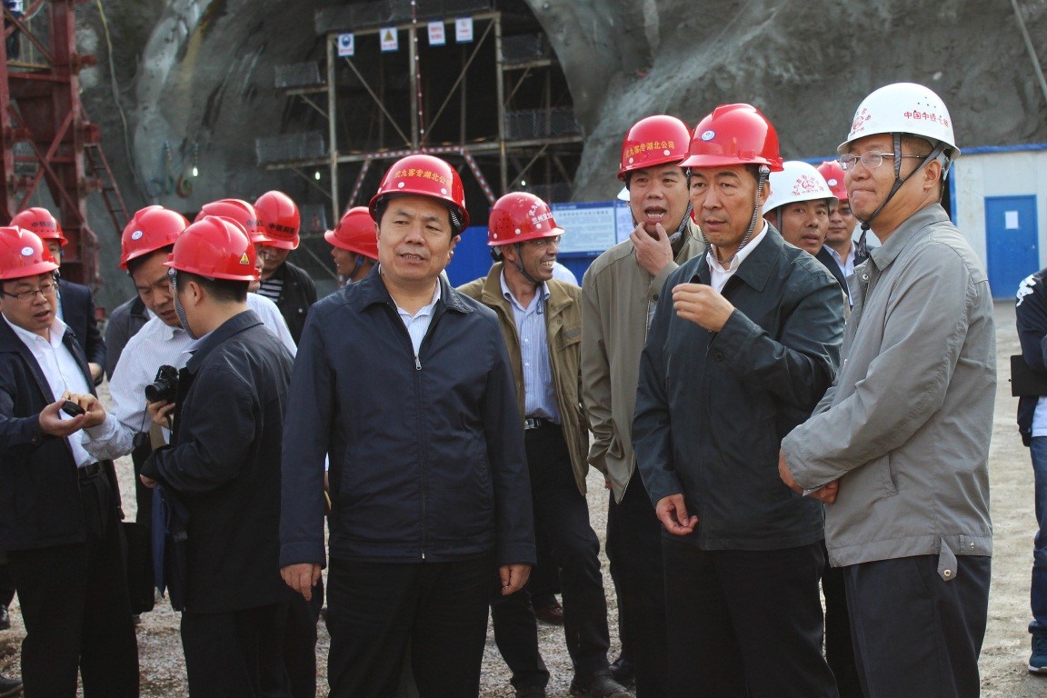 圖為局黨組成員、副局長(zhǎng)傅選義(前右二)檢查武九客專(zhuān)李家莊隧道施工現(xiàn)場(chǎng)。