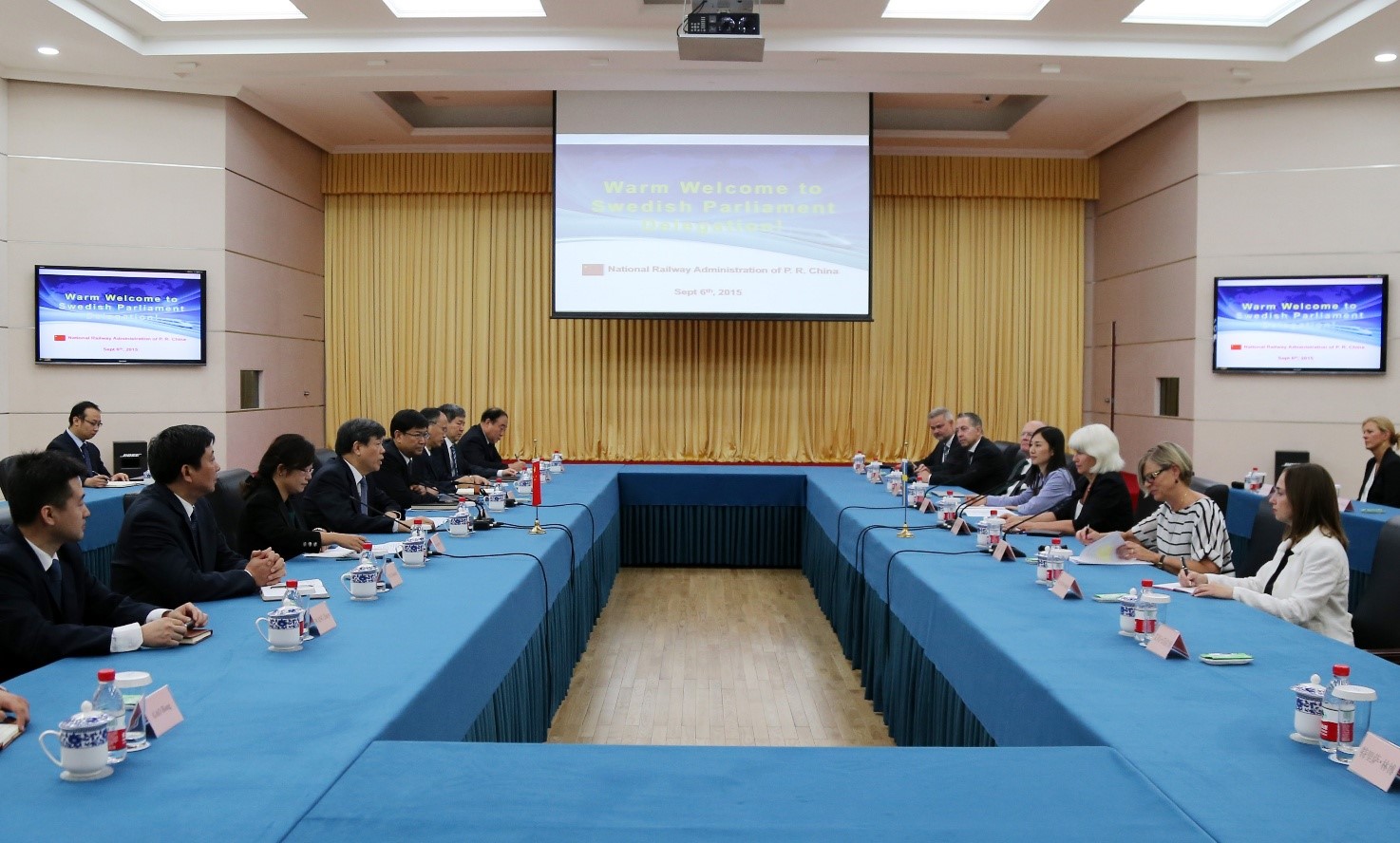 9月6日,國家鐵路局局長陸東福(左四)在北京會見了瑞典議會交通與通信委員會主席卡琳·史密斯(右三)一行。雙方就鐵路合作,尤其是高速鐵路發展廣泛深入交流。瑞典駐華大使羅睿德陪同參加會見。
