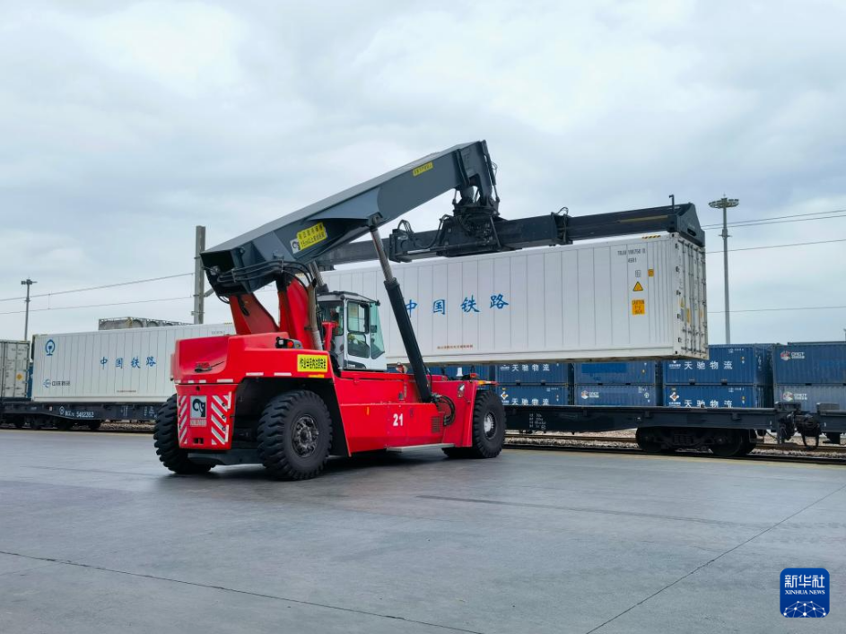 中鐵聯集昆明中心站內,工作人員將裝有熱帶水果的冷鏈集裝箱從中老鐵路國際貨物列車上卸下。