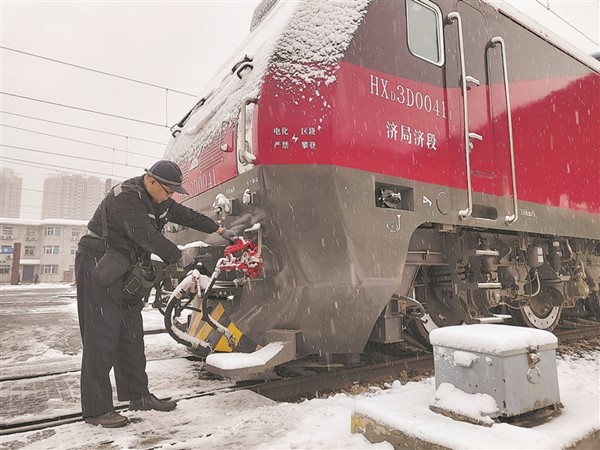 12月11日,濟南機務段組織技術骨干冒雪對出入庫機車進行質量檢查,確保機車狀態良好。
