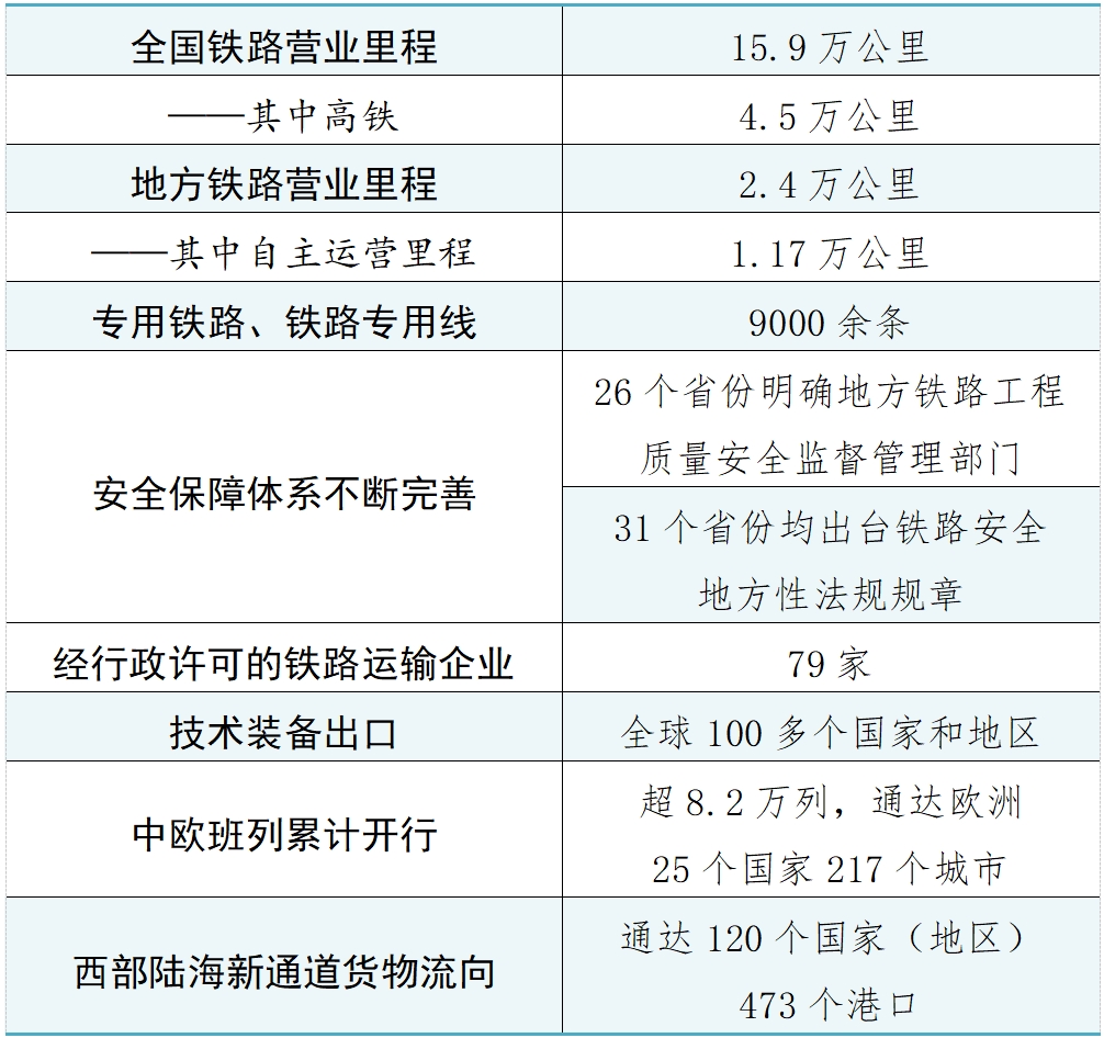 一是路網(wǎng)規(guī)模質(zhì)量大幅提升。“四縱四橫”高速鐵路主骨架全面建成,“八縱八橫”高速鐵路主通道和普速干線鐵路加快建設(shè),建成世界最大的高速鐵路網(wǎng),基本形成布局合理、覆蓋廣泛、層次分明、配置高效的鐵路網(wǎng)絡(luò)。截至2023年底,全國鐵路營業(yè)里程達(dá)到15.9萬公里,高鐵達(dá)到4.5萬公里。地方政府和社會(huì)資本投資鐵路蓬勃發(fā)展,地方鐵路營業(yè)里程達(dá)到2.4萬公里,其中自主運(yùn)營的里程達(dá)到1.17萬公里,還有專用鐵路、鐵路專用線9000余條。