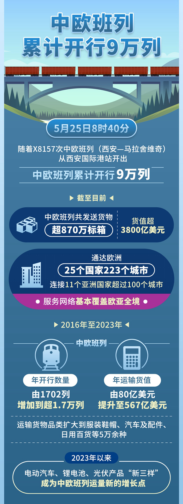 5月25日8時40分,隨著X8157次中歐班列(西安—馬拉舍維奇)從西安國際港站開出,中歐班列累計開行9萬列。截至目前,中歐班列共發送貨物超870萬標箱、貨值超3800億美元,通達歐洲25個國家223個城市,連接11個亞洲國家超過100個城市,服務網絡基本覆蓋歐亞全境。