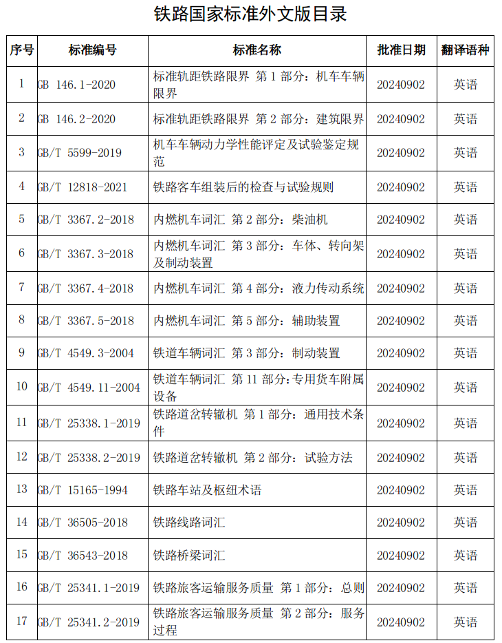 《標準軌距鐵路限界 第1部分:機車車輛限界》等 17項鐵路國家標準外文譯本正式發布