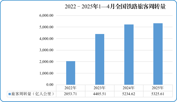 圖2 2022—2025年1—4月全國(guó)鐵路旅客周轉(zhuǎn)量