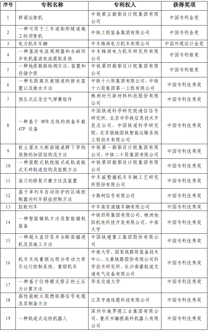 第二十五屆中國專利獎公布 鐵路行業榮獲三金兩銀