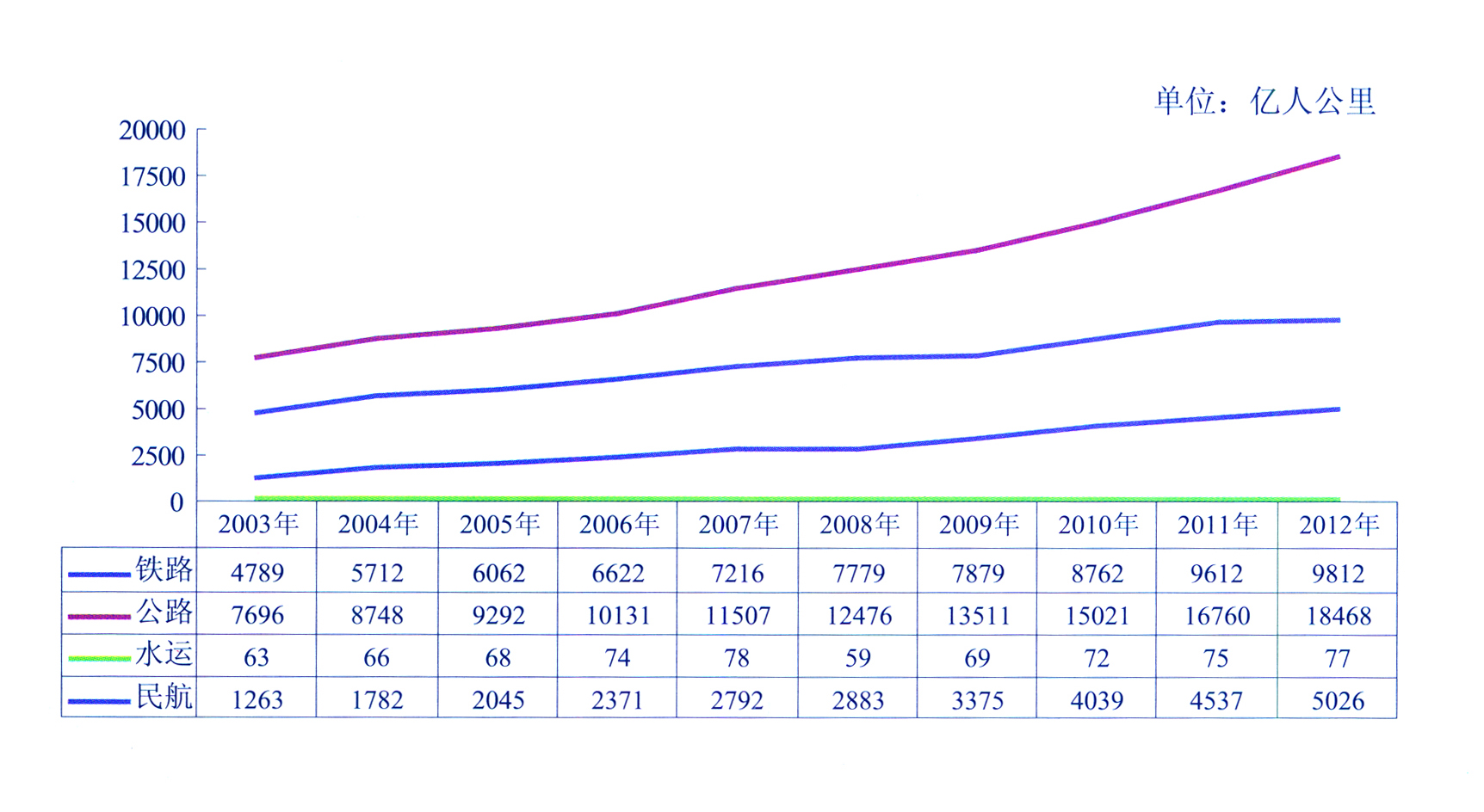 2003-2012年各種運輸方式客運周轉量