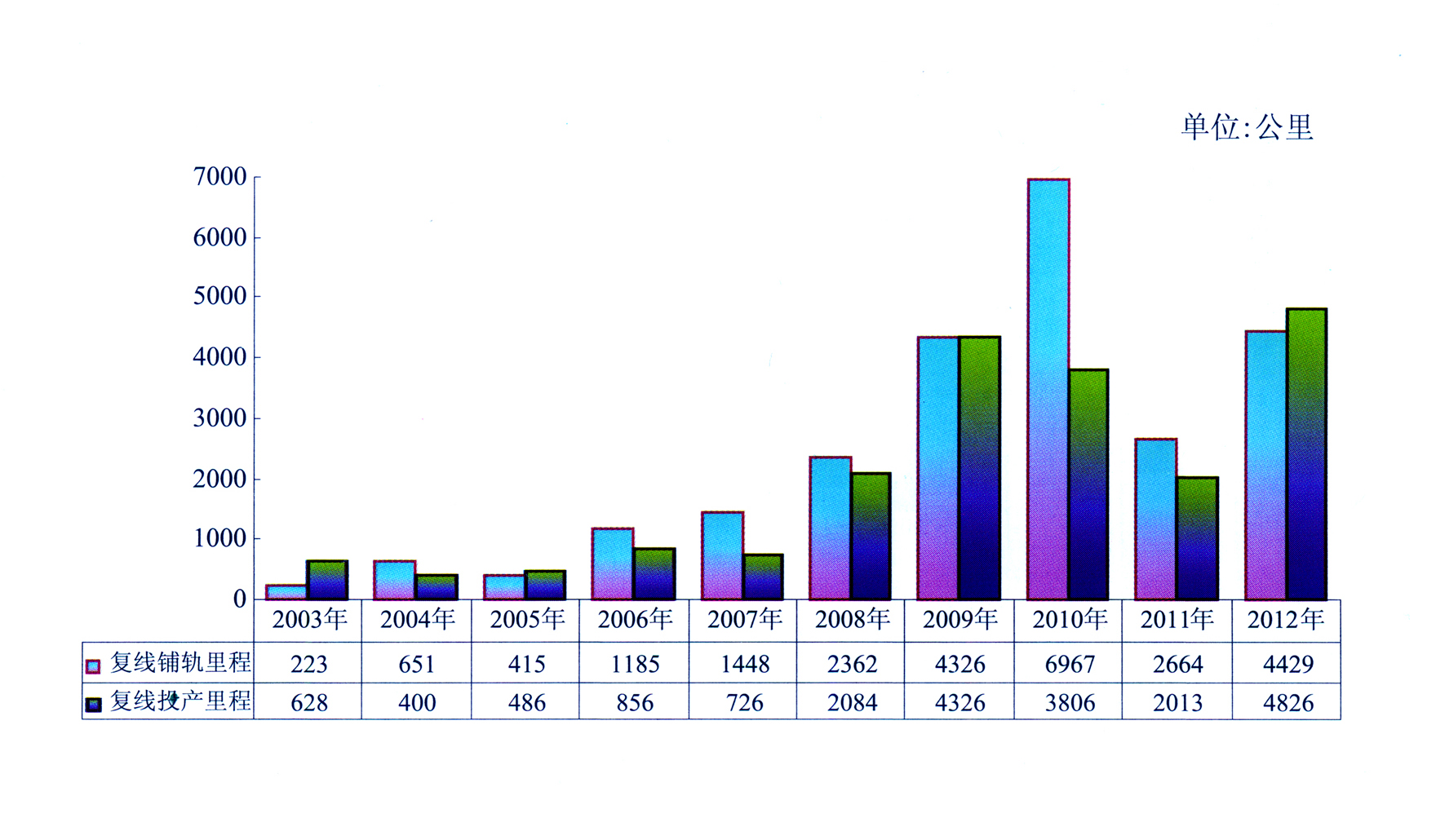 2003-2012年全國鐵路復線鋪軌、投產里程