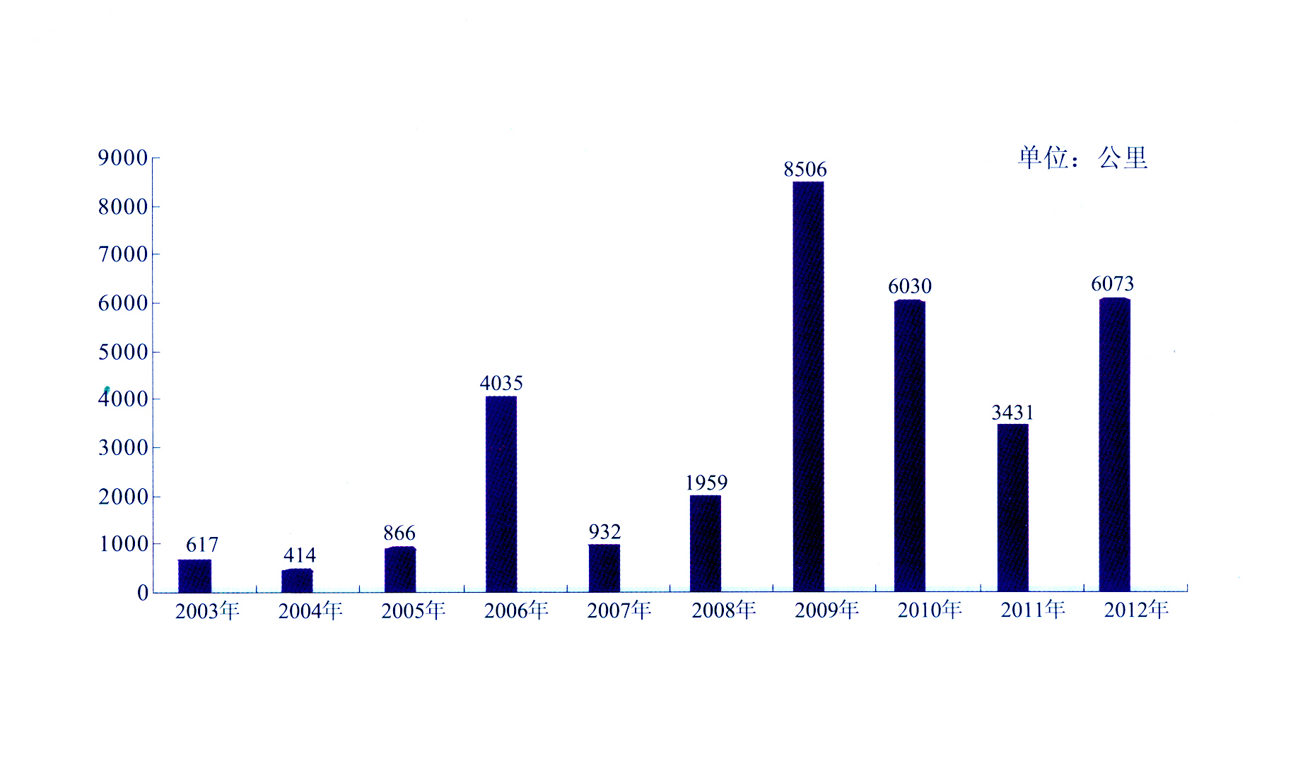 2003-2012年全國鐵路電氣化投產(chǎn)里程