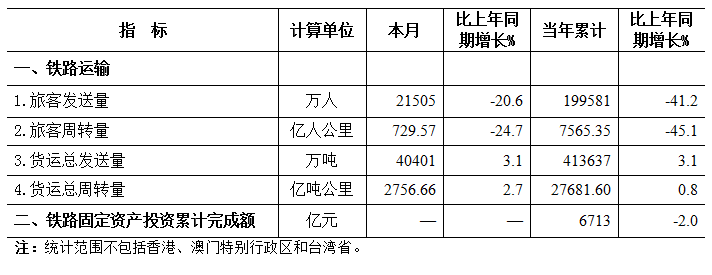 2020年11月份全國鐵路主要指標(biāo)完成情況