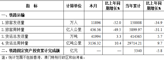 2022年10月份全國鐵路主要指標完成情況