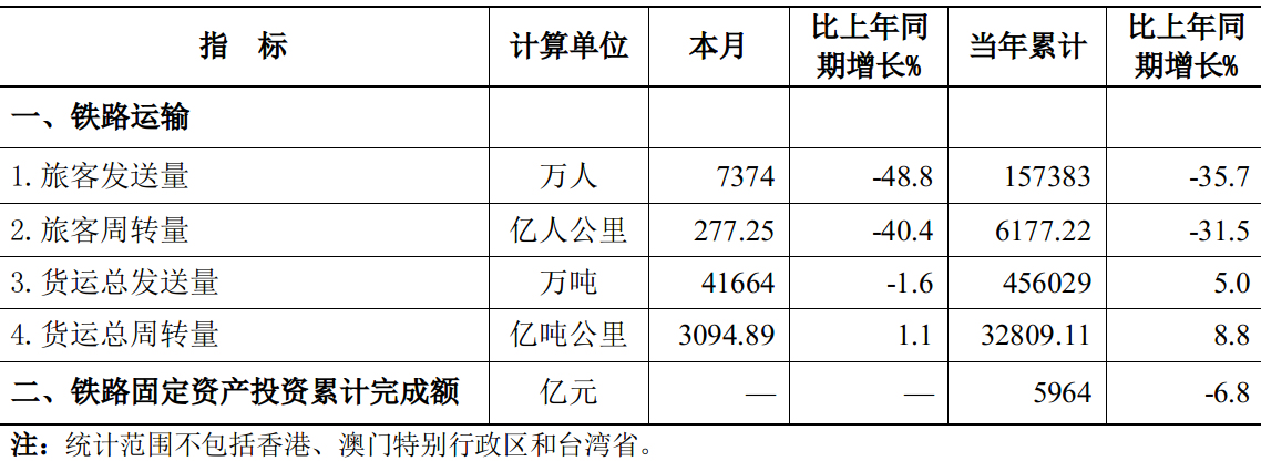 2022年11月份全國鐵路主要指標(biāo)完成情況