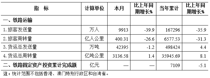 2022年12月份全國鐵路主要指標(biāo)完成情況