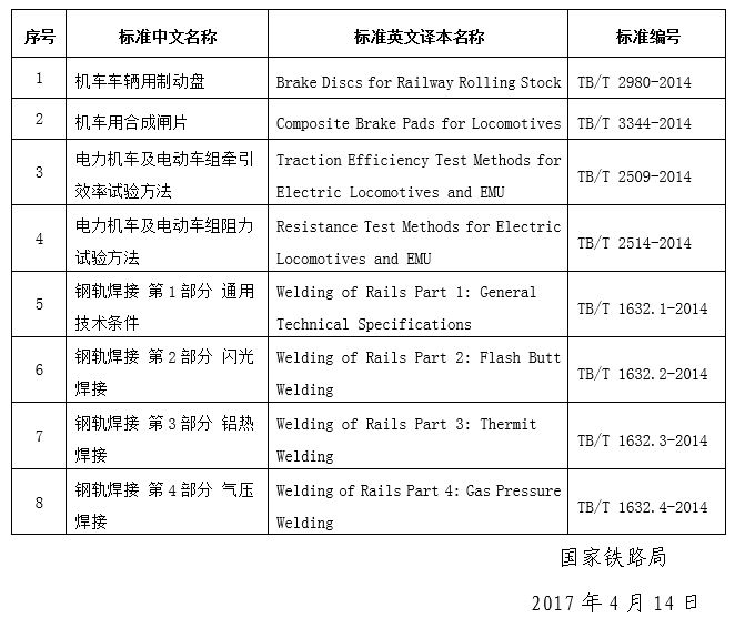 為推動中外鐵路技術(shù)交流,國家鐵路局組織了《機車車輛用制動盤》(TB/T 2980-2014)等8項鐵道行業(yè)技術(shù)標準英文翻譯工作。英文譯本與中文版鐵路技術(shù)標準在技術(shù)上出現(xiàn)異議時,以中文版為準。