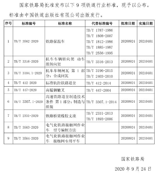 國家鐵路局發布《鐵路保溫車》等9項鐵道行業技術標準、《機車車輛用橡膠彈性元件通用技術條件...
