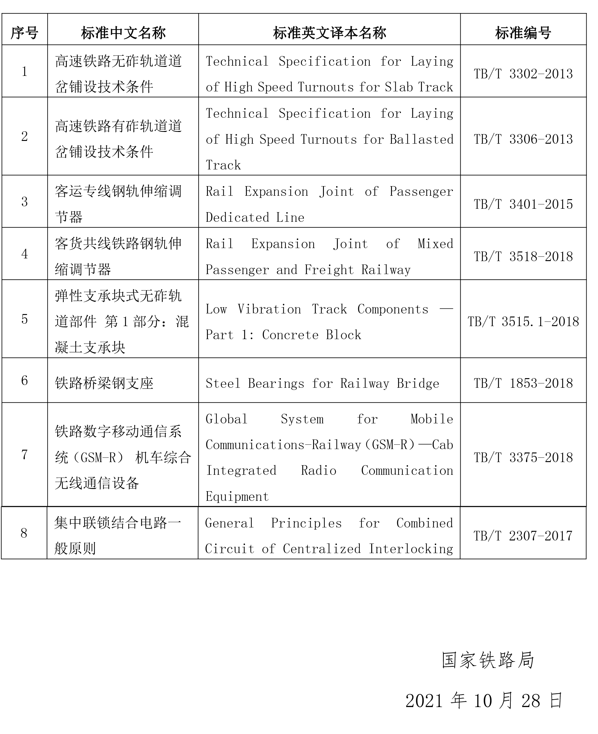 國家鐵路局關于發布《高速鐵路無砟軌道道岔鋪設技術條件》等8項鐵道行業技術標準英文譯本的公告
