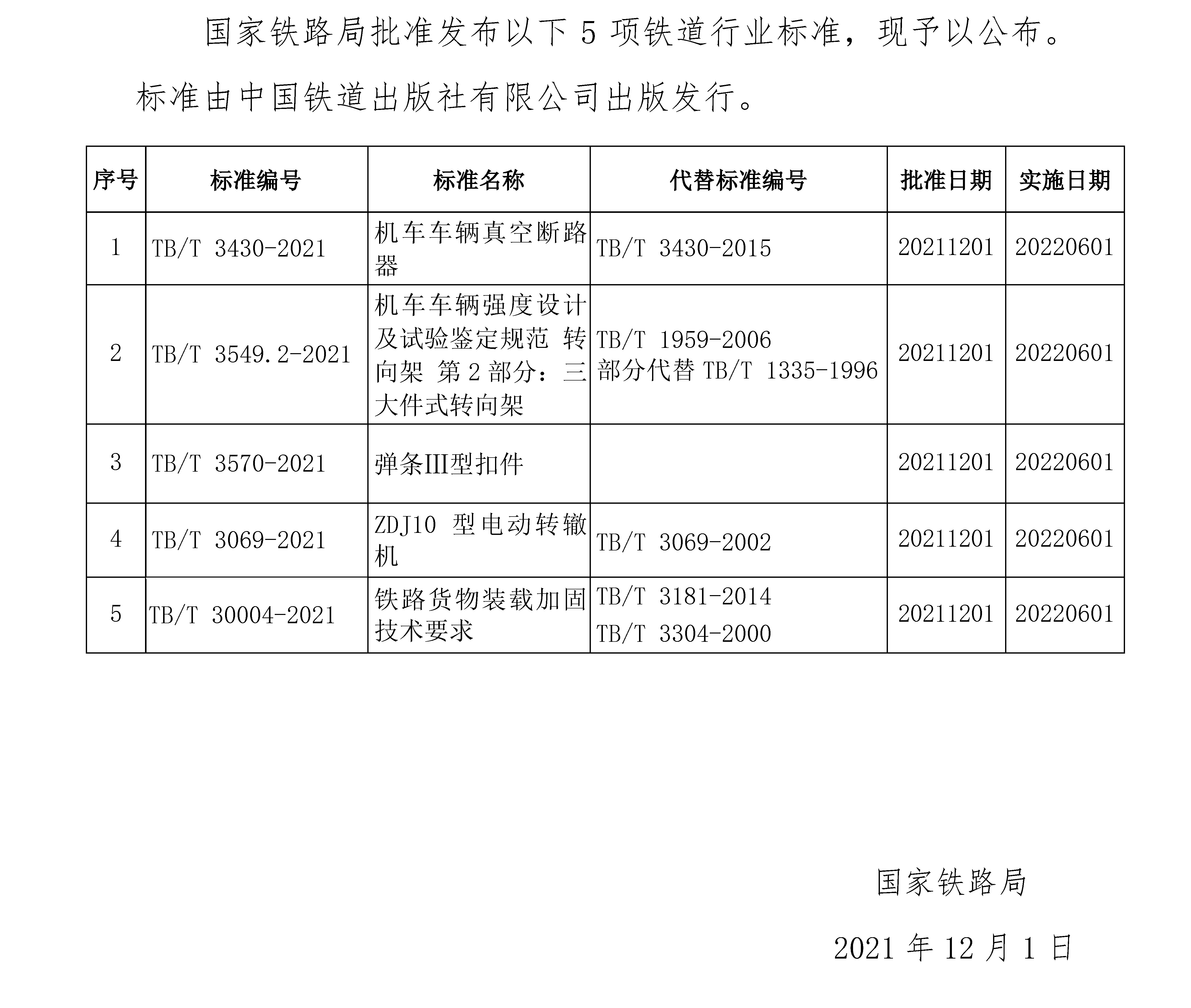 國家鐵路局關(guān)于發(fā)布鐵道行業(yè)標(biāo)準(zhǔn)的公告(技術(shù)標(biāo)準(zhǔn)2021年第4批)