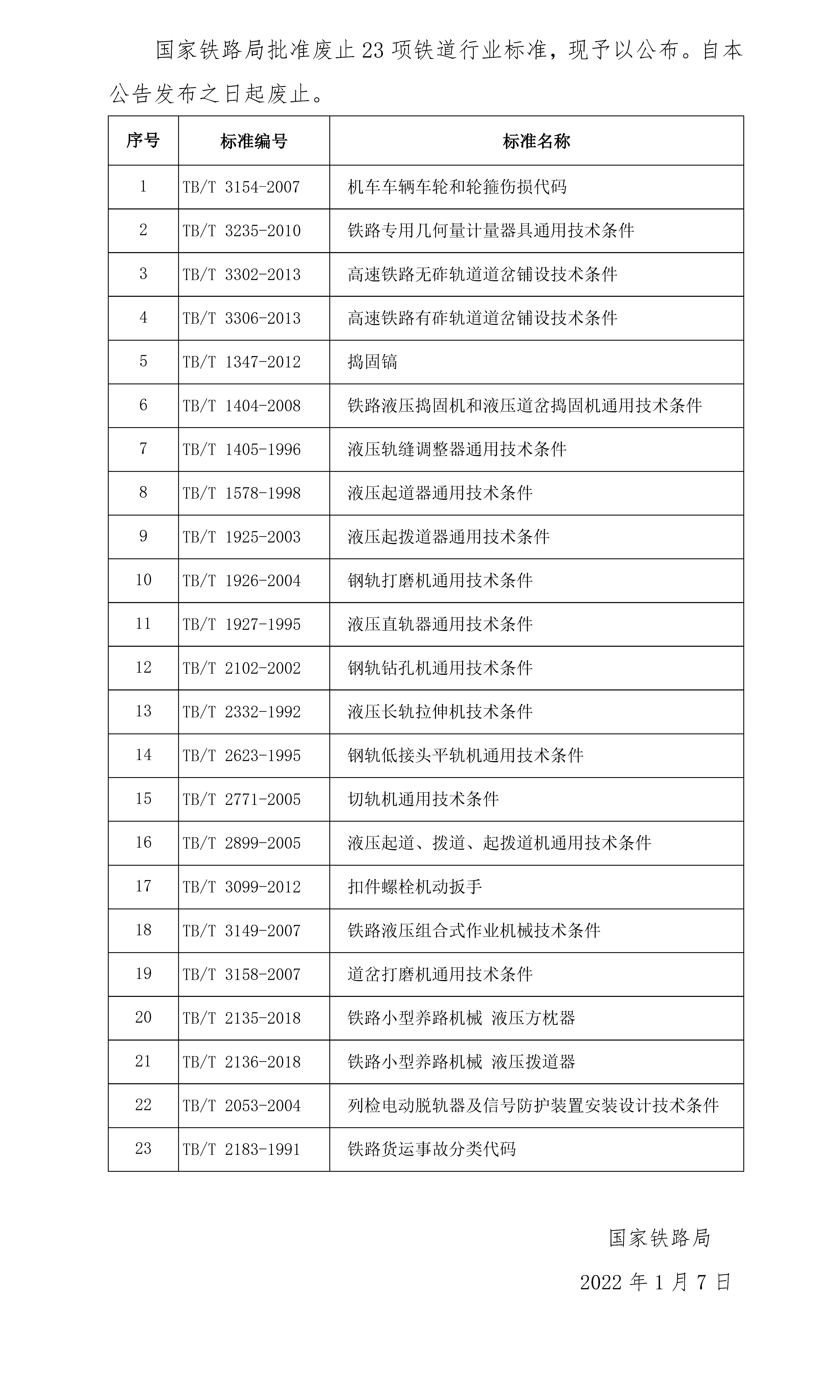 國(guó)家鐵路局批準(zhǔn)廢止《機(jī)車(chē)車(chē)輛車(chē)輪和輪箍傷損代碼》等23項(xiàng)鐵道行業(yè)標(biāo)準(zhǔn),現(xiàn)予以公布。自本公...
