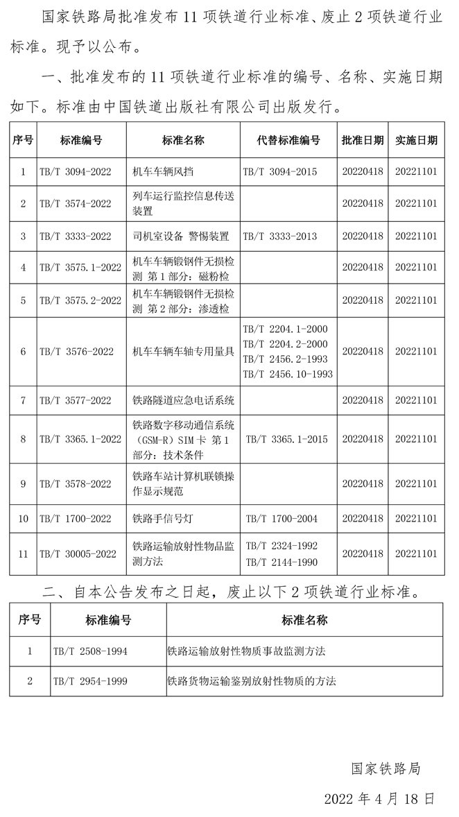 國家鐵路局關于發布鐵道行業標準的公告(技術標準2022年第3批)