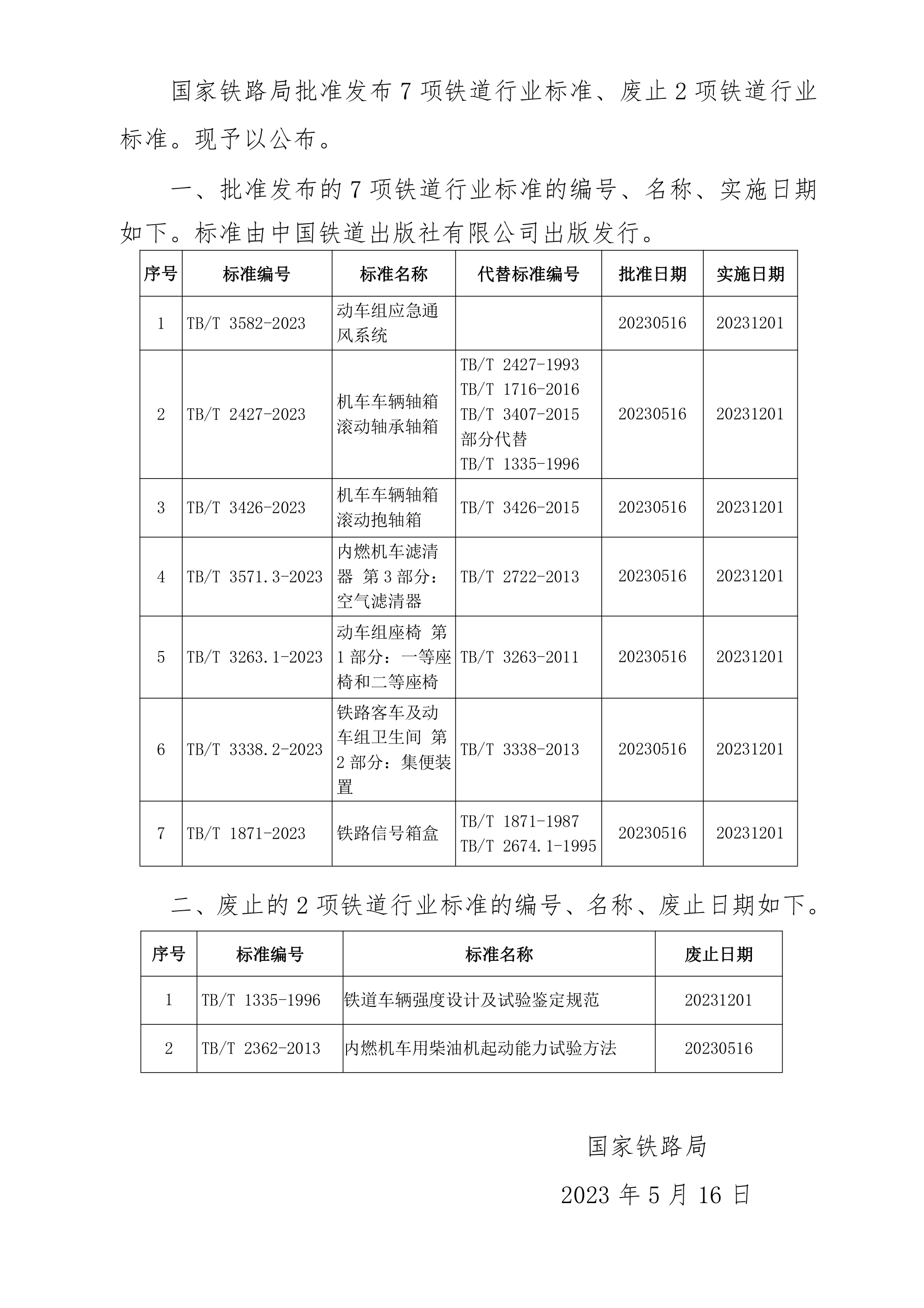 國家鐵路局關(guān)于發(fā)布鐵道行業(yè)標(biāo)準(zhǔn)的公告(技術(shù)標(biāo)準(zhǔn)2023年第3批)