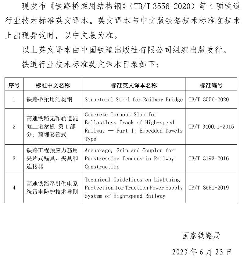 國家鐵路局關于發布《鐵路橋梁用結構鋼》等4項鐵道行業技術標準英文譯本的公告