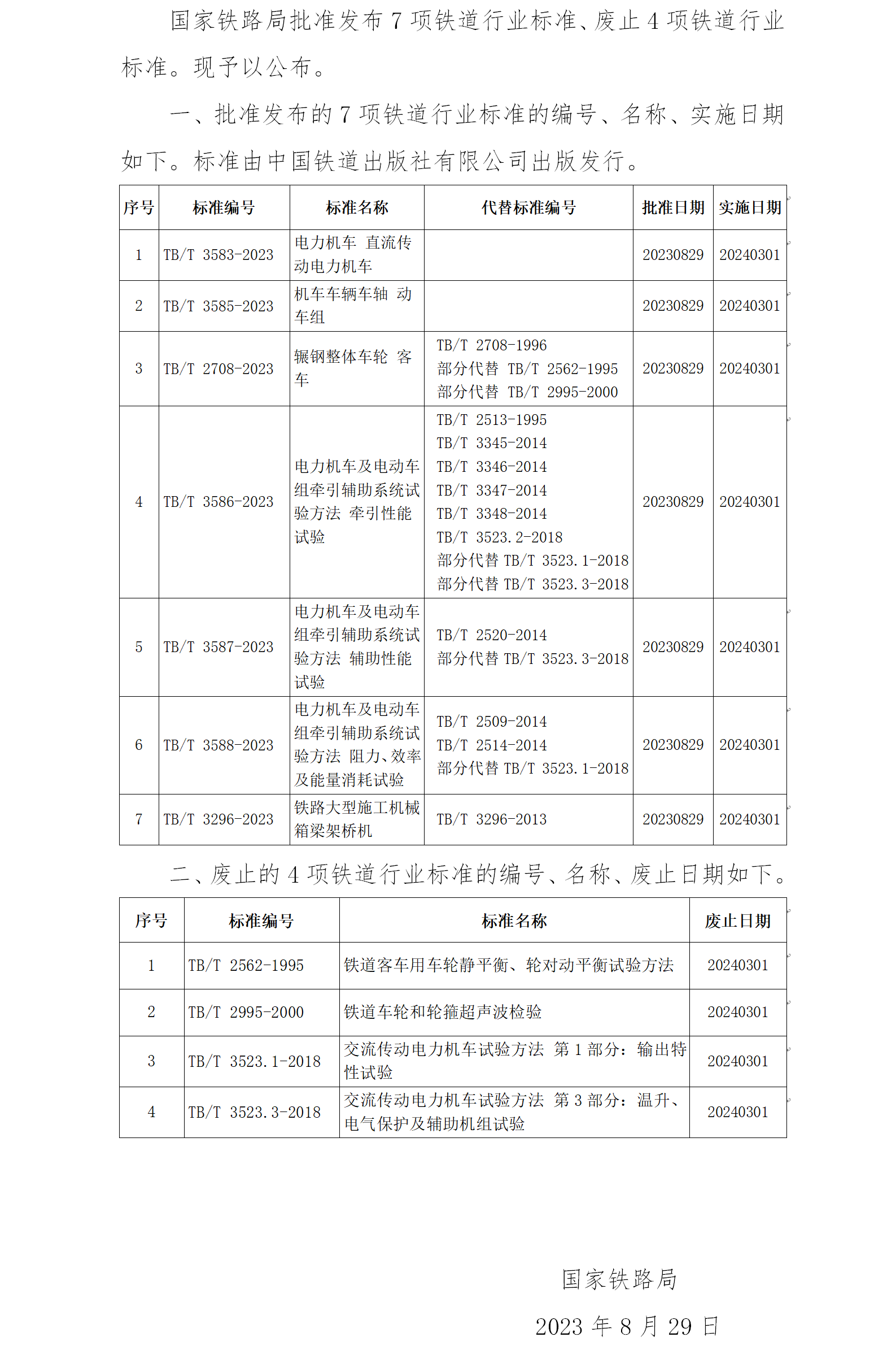 國家鐵路局關于發布鐵道行業標準的公告(技術標準2023年第6批)