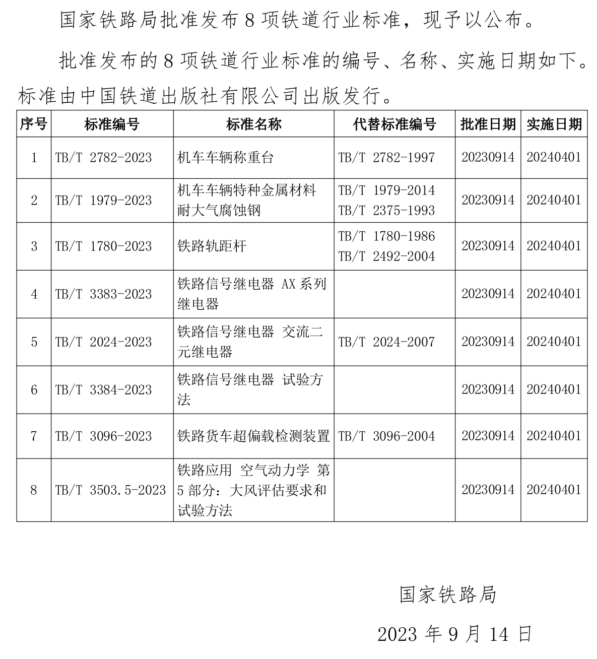 國家鐵路局關于發布鐵道行業標準的公告(技術標準2023年第8批)