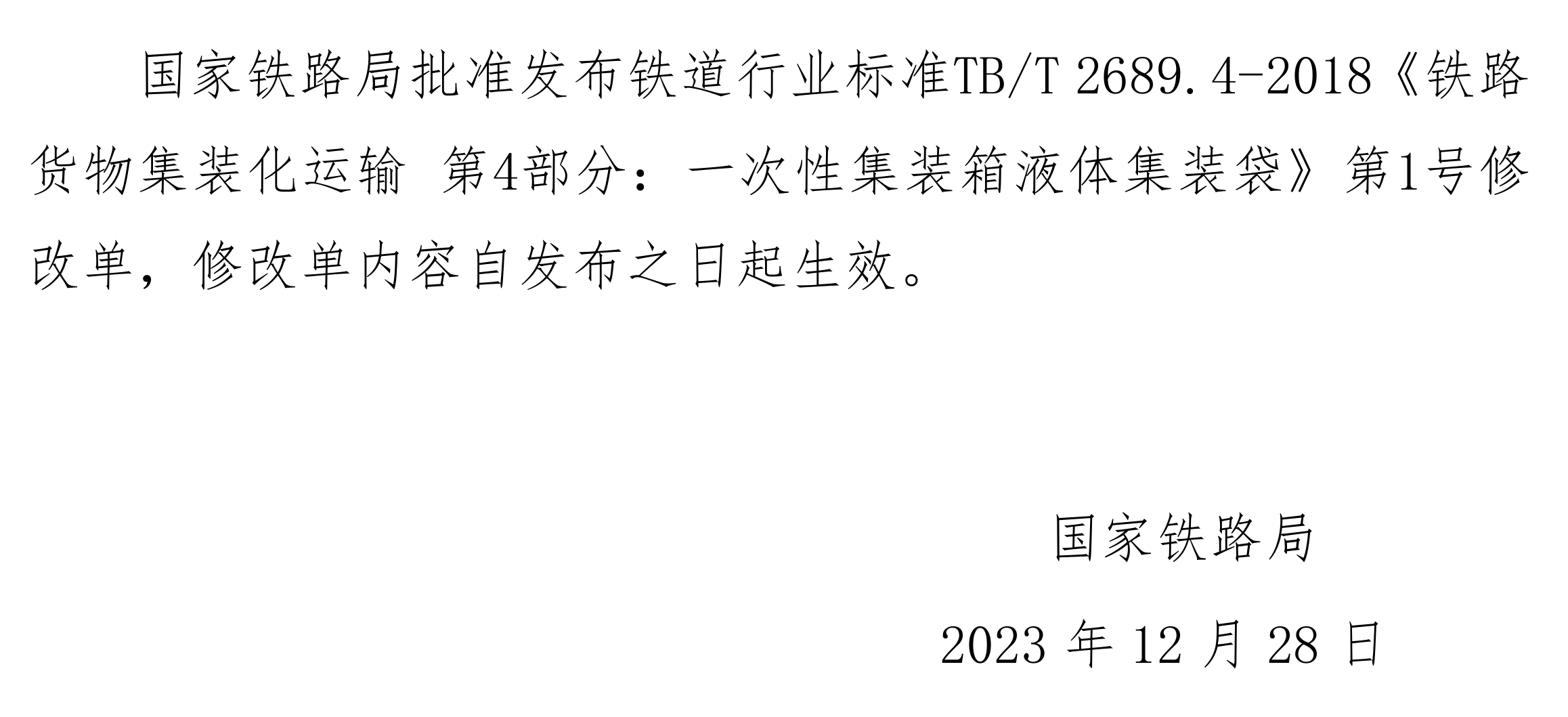 國家鐵路局發布鐵道行業標準《鐵路貨物集裝化運輸 第4部分:一次性集裝箱液體集裝袋》修改單。