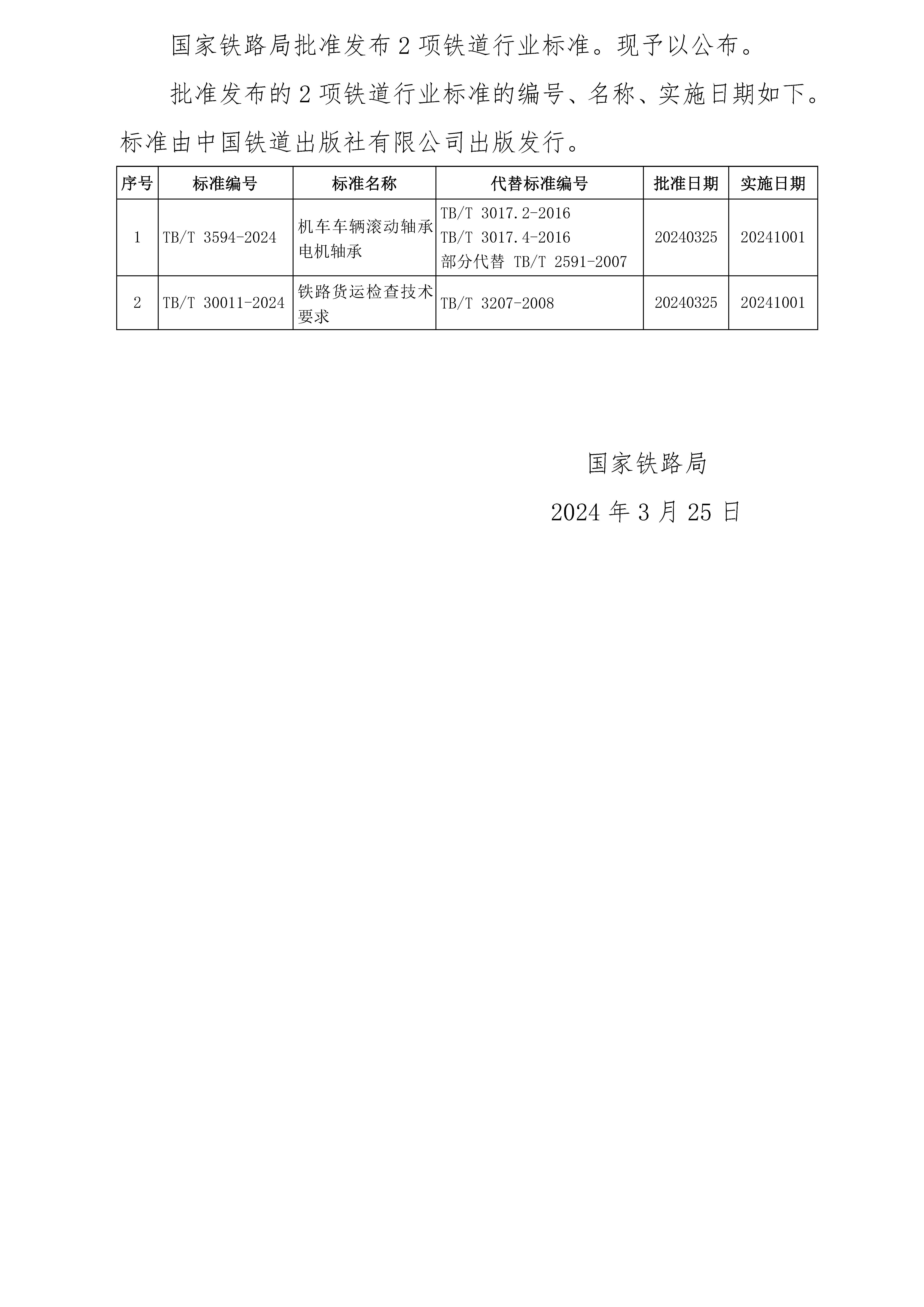 國家鐵路局關于發布鐵道行業標準的公告(技術標準2024年第2批)