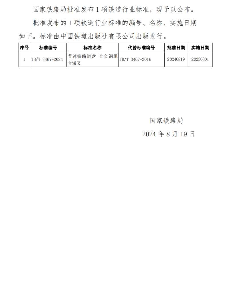 國家鐵路局批準發布鐵道行業標準《普速鐵路道岔 合金鋼組合轍叉》。