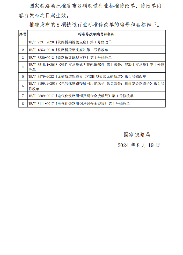 國家鐵路局關于發布鐵道行業標準的公告(技術標準2024年第8批)