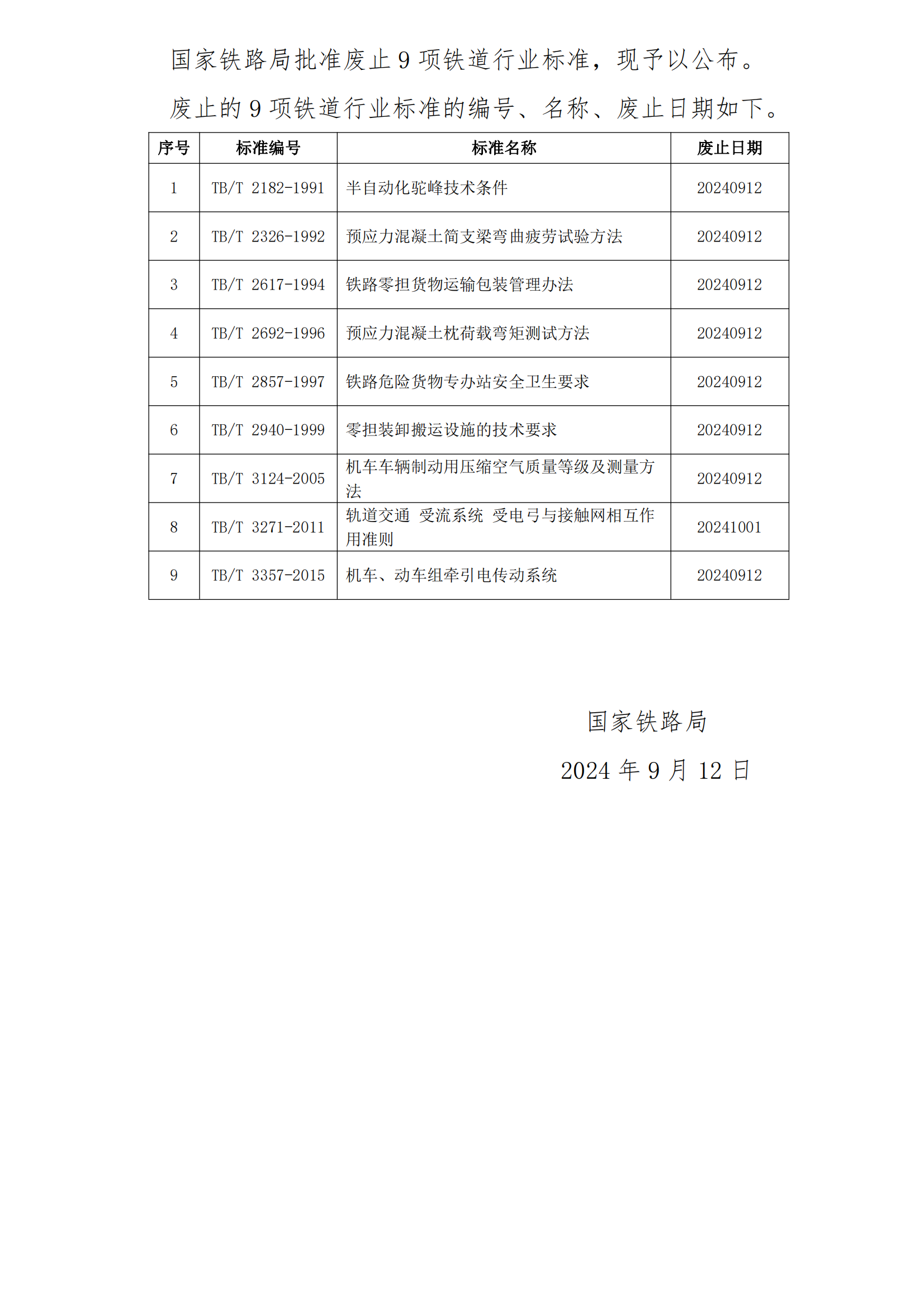 國家鐵路局批準廢止《半自動化駝峰技術條件》等9項鐵道行業(yè)標準。