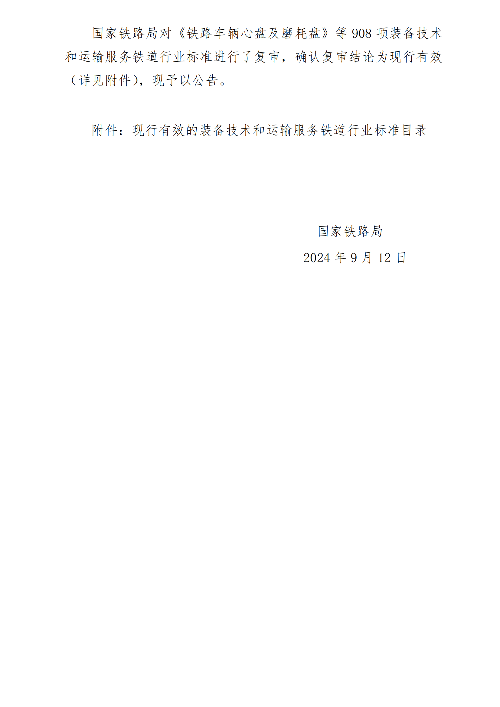 國家鐵路局關于《鐵路車輛心盤及磨耗盤》等908項鐵道行業標準復審為現行有效的公告