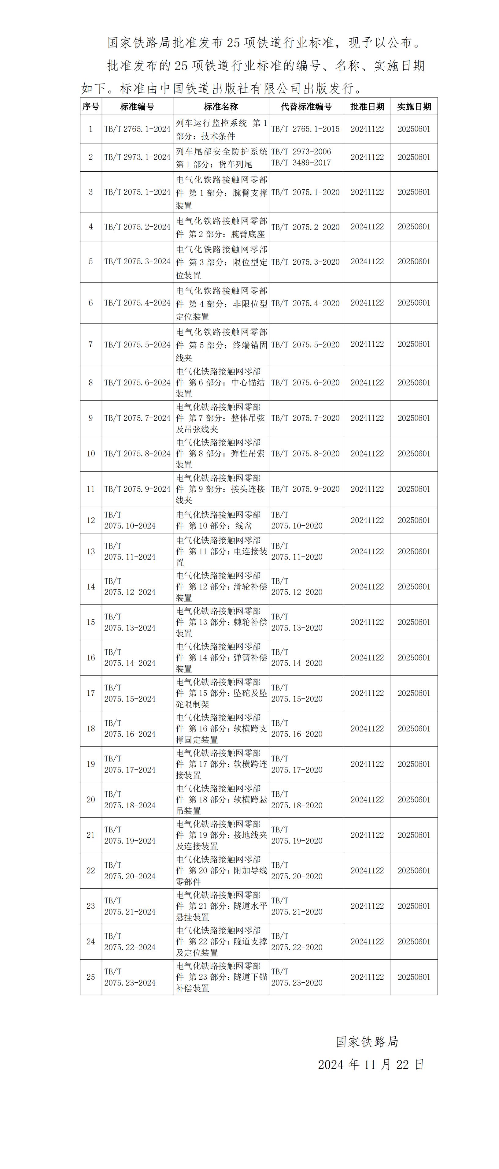 國家鐵路局關于發布鐵道行業標準的公告(技術標準2024年第10批)
