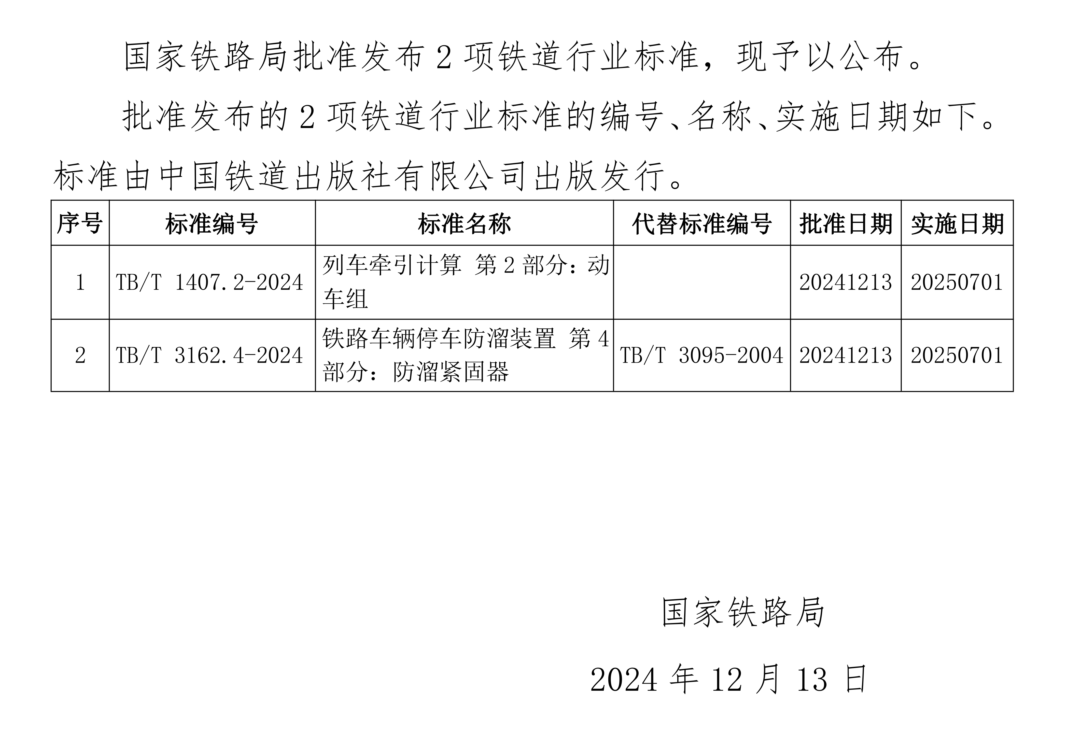 國家鐵路局關(guān)于發(fā)布鐵道行業(yè)標準的公告(技術(shù)標準2024年第12批)