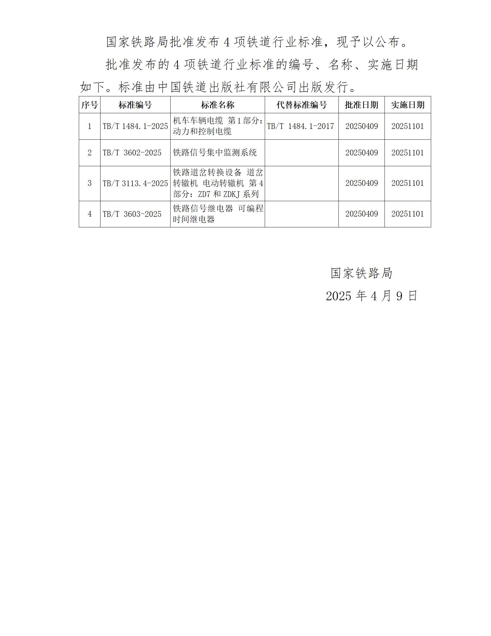 國家鐵路局關(guān)于發(fā)布鐵道行業(yè)標(biāo)準的公告(技術(shù)標(biāo)準2025年第1批)