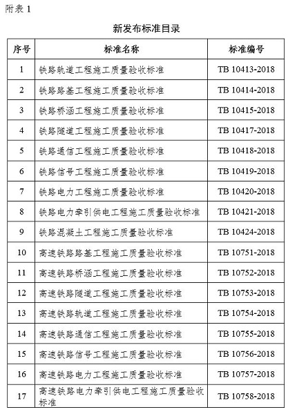 現(xiàn)公布《鐵路軌道工程施工質(zhì)量驗(yàn)收標(biāo)準(zhǔn)》(TB 10413-2018)等17項(xiàng)鐵路工程建設(shè)標(biāo)準(zhǔn)(詳見(jiàn)附表1),自2019年2月1日起實(shí)施。《鐵路軌道工程施工質(zhì)量驗(yàn)收標(biāo)準(zhǔn)》(TB 10413-2003)等20項(xiàng)鐵路工程建設(shè)標(biāo)準(zhǔn)(詳見(jiàn)附表2)同時(shí)廢止。
