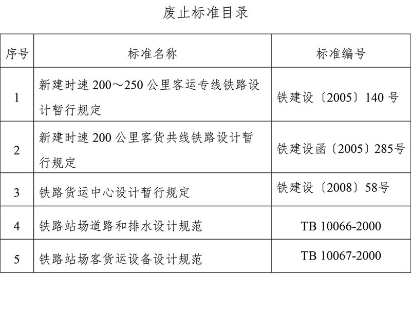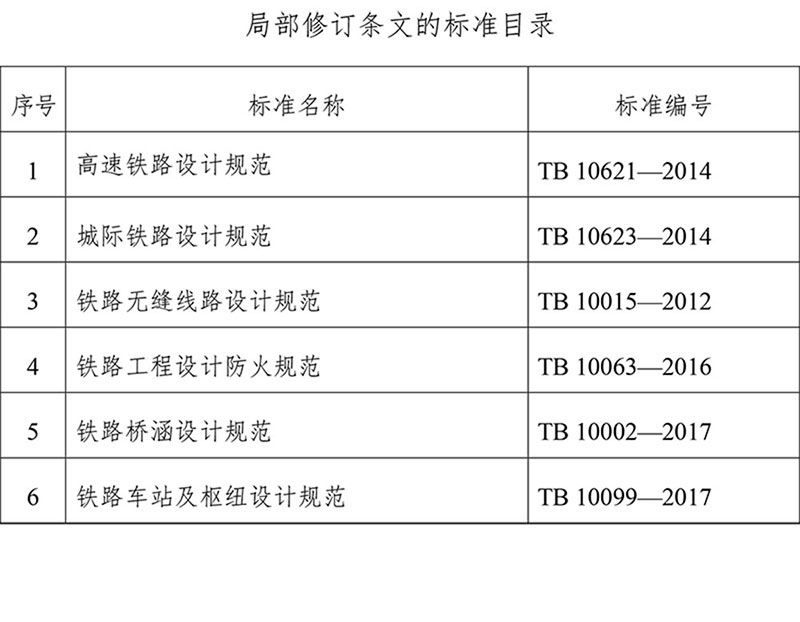 現(xiàn)公布《高速鐵路設(shè)計(jì)規(guī)范》(TB 10621-2014)等6項(xiàng)標(biāo)準(zhǔn)的局部修訂條文,同時(shí)廢止《新建時(shí)速200~250公里客運(yùn)專(zhuān)線(xiàn)鐵路設(shè)計(jì)暫行規(guī)定》(鐵建設(shè)〔2005〕140號(hào))等5項(xiàng)標(biāo)準(zhǔn),自2019年7月31日起施行。上述局部修訂原標(biāo)準(zhǔn)的相應(yīng)條文及相關(guān)內(nèi)容同時(shí)廢止。本局部修訂條文由國(guó)家鐵路局科技與法制司負(fù)責(zé)解釋。