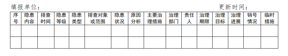 隱患數(shù)據(jù)庫(kù)應(yīng)當(dāng)包括隱患內(nèi)容、排查時(shí)間、隱患等級(jí)、治理措施、治理部門(mén)和責(zé)任人、治理期限、銷(xiāo)號(hào)情況等內(nèi)容,其中,重大隱患數(shù)據(jù)庫(kù)還應(yīng)當(dāng)包括排查部門(mén)、隱患類型、排查對(duì)象或范圍、隱患狀況、原因分析、主要治理措施、治理目標(biāo)、治理進(jìn)展、臨時(shí)措施等內(nèi)容。