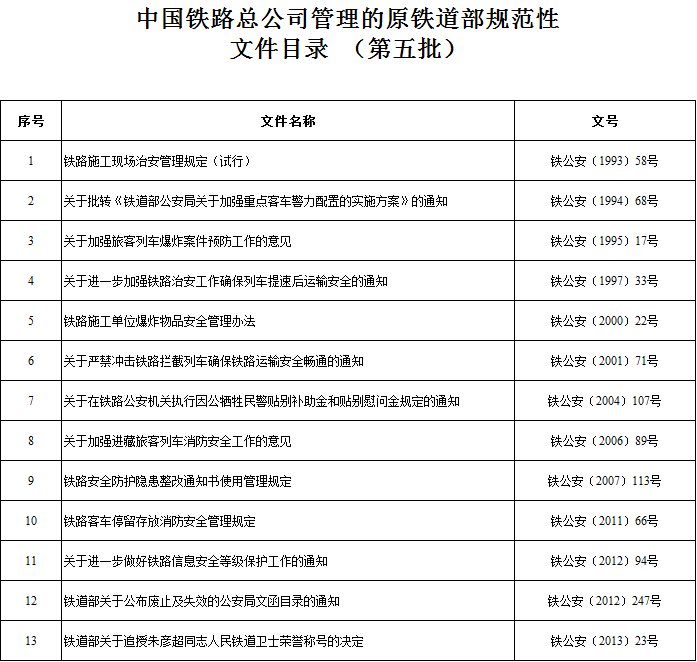 附件:中國鐵路總公司管理的原鐵道部規范性文件目錄 (第五批)