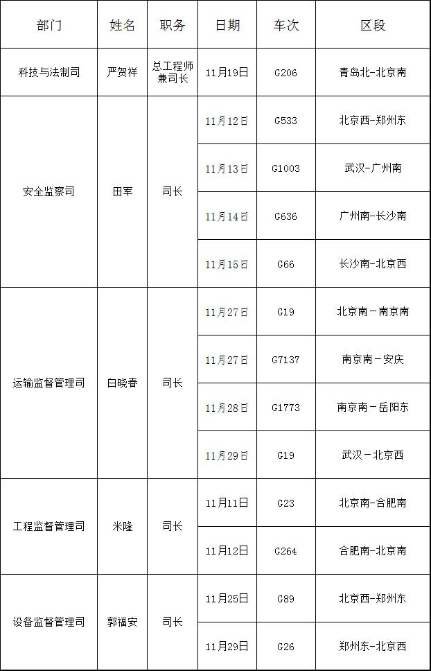 2019年11月份國家鐵路局機(jī)關(guān)部門主要負(fù)責(zé)人添乘情況