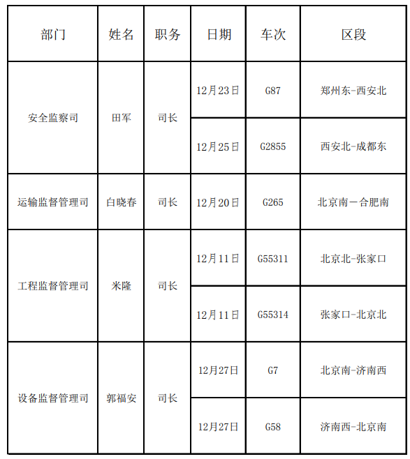 2019年12月份國家鐵路局機關(guān)部門主要負責(zé)人添乘情況