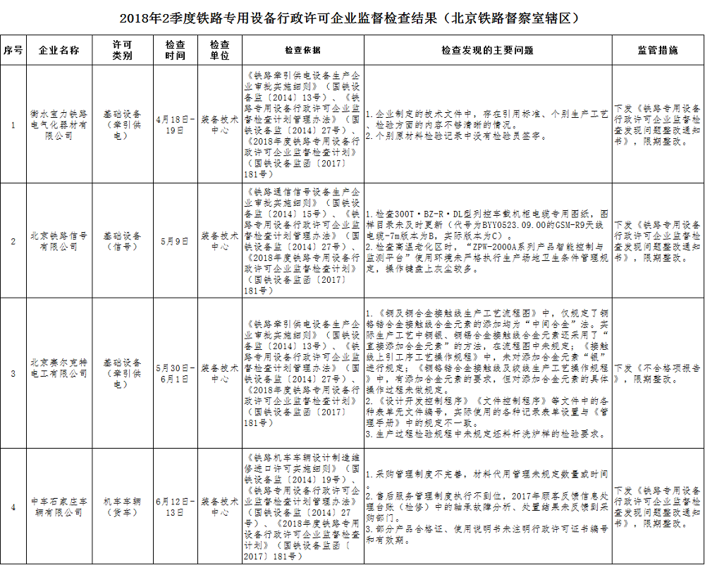 2季度,各地區鐵路監督管理局認真按照《國家鐵路局關于印發<2018年度鐵路專用設備行政許可企業監督檢查計劃>的通知》(國鐵設備監函〔2017〕181號)要求,對轄區內搖號隨機確定的鐵路專用設備行政許可受檢企業按程序、按標準開展監督檢查,共檢查企業21家,發現問題167項,下發《鐵路專用設備行政許可企業監督檢查發現問題整改通知書》21份。按企業生產類別分,鐵路機車車輛生產企業13家、鐵路運輸基礎設備生產企業8家;按企業監管轄區分,沈陽鐵路監督監管局轄區4家、上海鐵路監督管理局轄區3家、廣州鐵路監督管理局轄區4家、成都鐵路監督管理局轄區3家、武漢鐵路監督管理局轄區2家、西安鐵路監督管理局轄區4家、蘭州鐵路監督管理局1家。設備監督管理司組織裝備技術中心對北京鐵路督察室轄區內4家鐵路專用設備行政許可受檢企業(鐵路機車車輛生產企業1家、鐵路運輸基礎設備生產企業3家)開展監督檢查,共發現問題19項,下發《鐵路專用設備行政許可企業監督檢查發現問題整改通知書》3份和《不合格項報告》1份,監督檢查情況詳見附表。