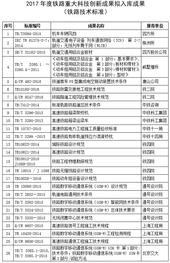 附件:2017年度鐵路重大科技創(chuàng)新成果擬入庫成果(鐵路技術(shù)標(biāo)準(zhǔn))