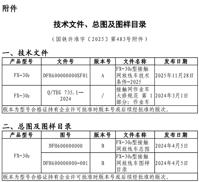 1.準(zhǔn)予你單位FX-30J型鐵路基礎(chǔ)設(shè)施檢修裝備維修(大修)許可,并向你單位頒發(fā)維修許可證(含附表),證書編號(hào):TXZW0507-03472,有效期至2030年12月30日;