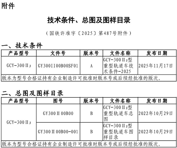 1.準(zhǔn)予你單位GCY-300ⅡJ型鐵路基礎(chǔ)設(shè)施檢修裝備制造許可,并向你單位頒發(fā)制造許可證(含附表),證書編號(hào):TXZZ0501-00095,有效期至2029年9月15日;
