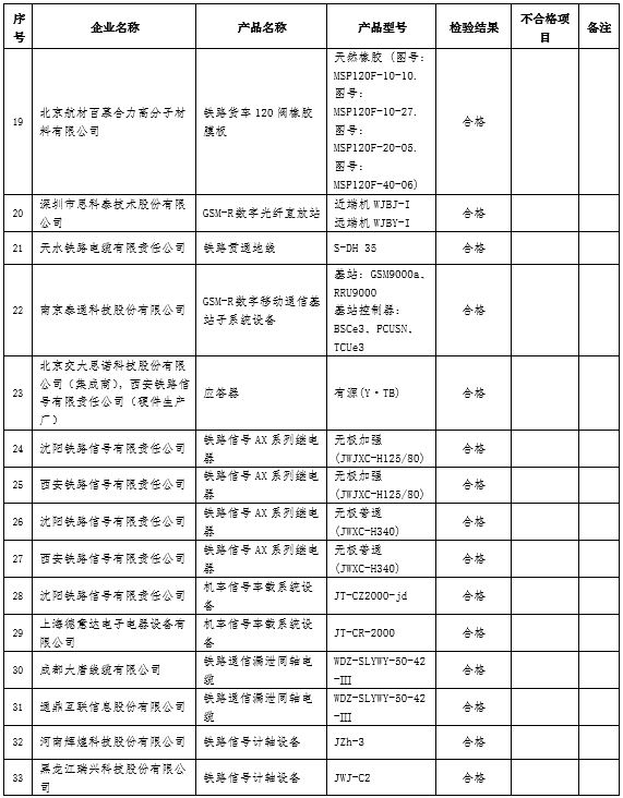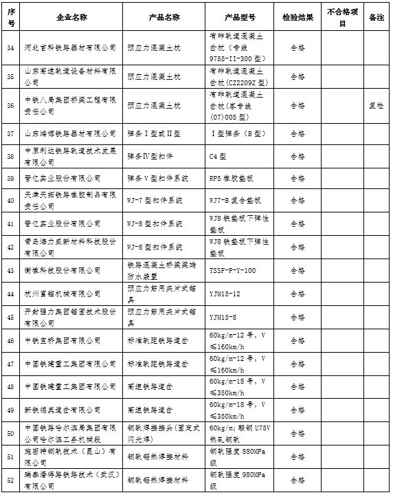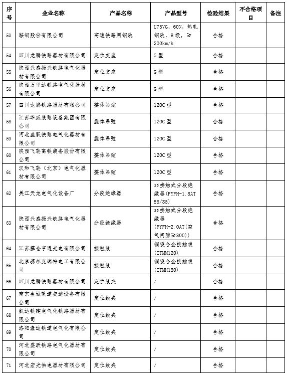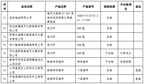 本批抽查38種產品76個廠項,合格74個,不合格2個。按產品分類,本批抽查機車車輛類產品19個廠項,合格19個;通信信號類產品14個廠項,合格14個;工務類產品21個廠項,合格20個,不合格1個;牽引供電類產品22個廠項,合格21個,不合格1個。
