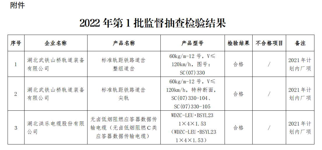 根據《鐵路專用產品質量監督抽查管理辦法》(國鐵設備監規〔2020〕63號),現將2022年第1批鐵路專用產品質量監督抽查情況通報如下。