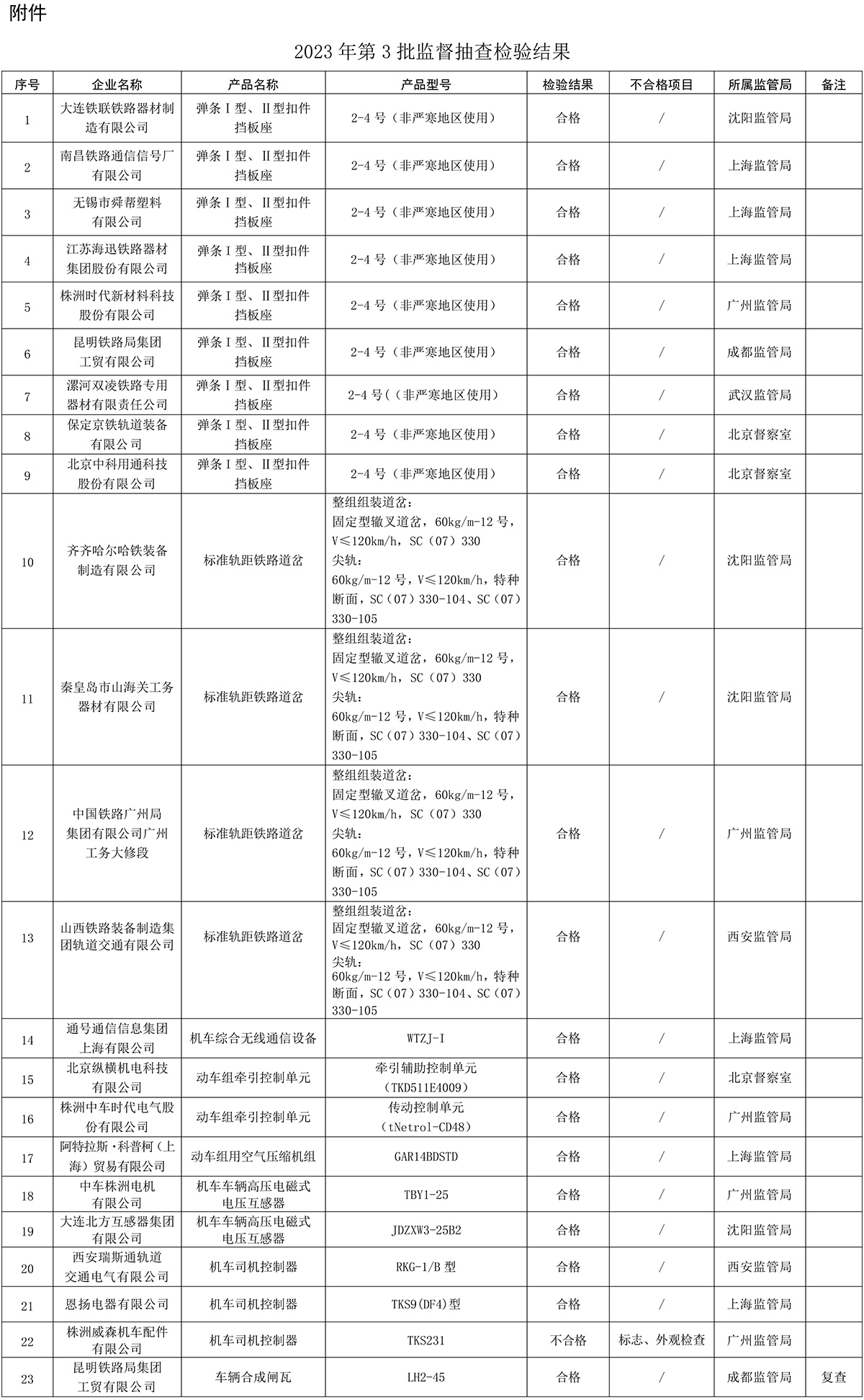 根據《鐵路專用產品質量監(jiān)督抽查管理辦法》(國鐵設備監(jiān)規(guī)〔2023〕18號)相關要求,現(xiàn)將2023年第3批鐵路專用產品質量監(jiān)督抽查情況通報如下: