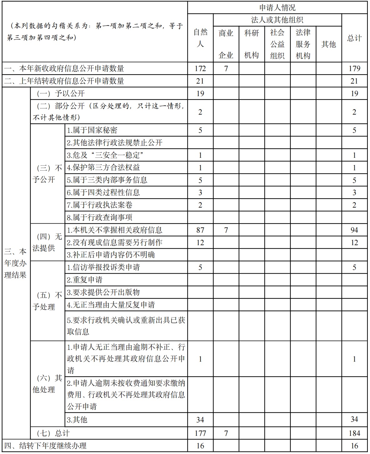 (二)依法做好依申請公開。2024年,共辦理各類政府信息公開申請200件,其中2023年結轉21件,2024年新增179件(結轉16件下年度辦理)。申請事項主要集中在鐵路運輸服務質量監(jiān)管、工程質量監(jiān)管、統(tǒng)計數(shù)據(jù)等方面。