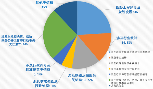 從申請公開信息內容看,120件申請件中共涉及175項內容,其中涉及鐵路工程建設及規劃發展的42項,占24%;涉及行業統計的26項,占14.86%;涉及鐵路運輸服務類信息的24項,占13.72%;涉及事故調查及行政處罰的9項,占5.14%;涉及行政許可及標準規范類信息9項,占5.14%;涉及財政預決算、信訪、政務公開工作等行政事務類信息44項,占25.14%;其他類信息21項,占12%。